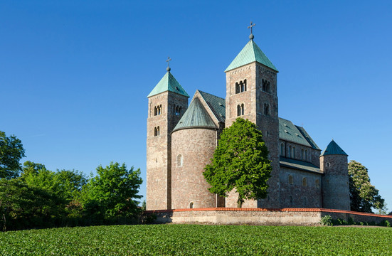 让我们从最早的年代开始说起:罗马式建筑。它最早在6-11世纪之间出现,大多被用于建造城堡和教堂。它的特点是大体量、厚墙体、圆拱和高大的塔柱。在敌人入侵时,它还有充当避难所的作用。这也是为什么如今我们看到的罗马式建筑总是非常的高大朴实,结构对称。圣玛丽和圣亚历克乌斯学院教堂是欧洲最具特点的罗马式建筑之一。