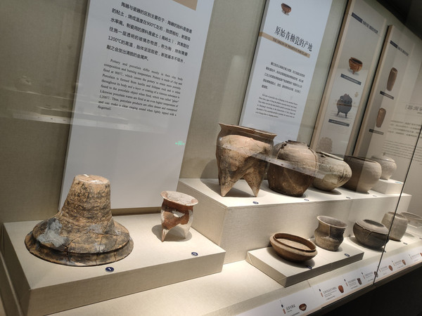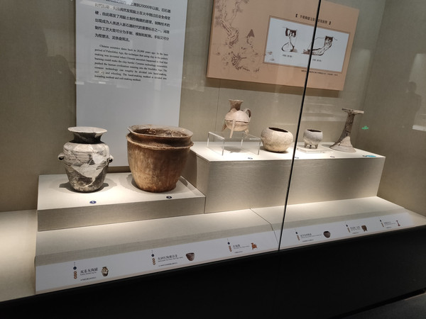 青铜展厅旁边是陶瓷器展厅,陶器出现的年代比较早,随着史前人类进入新石器时代就出现了陶器,我国目前发现最早的陶残片出土于南方地区的洞穴遗址,距今已经有近万年了。陶器的发明与人类用火有着密切关系,被火焙烧的大地或粘土因为落入火堆而变得坚硬,使原始先民有意识地用泥土制作他们需要的各种器物。