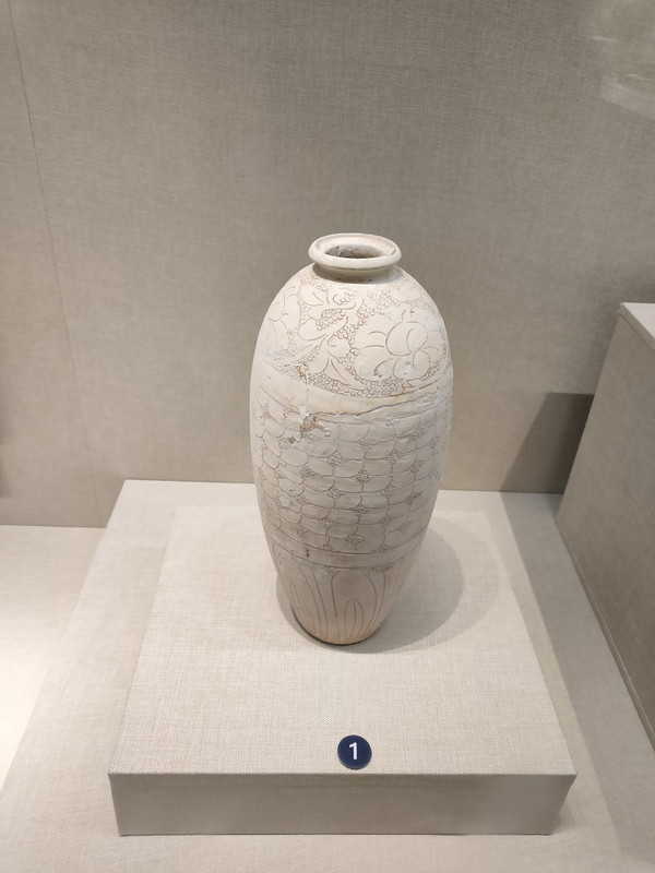 有一件吉州窑白釉刻花梅月纹瓷罐虽然体量不大,但着实精致。釉色细腻洁白,壶身上刻着梅枝。