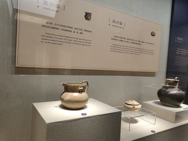 宜兴窑位于宜兴丁蜀镇,始创于东吴,器物造型和装饰方法与越窑相类。洪州窑位于江西省丰城市,始烧于东汉晚期,东晋、南朝进入兴盛期,镇江出土的洪州窑以东晋时期为多,有青釉碗、盘、香蕉、钵、青釉褐彩带盖四系罐等。
