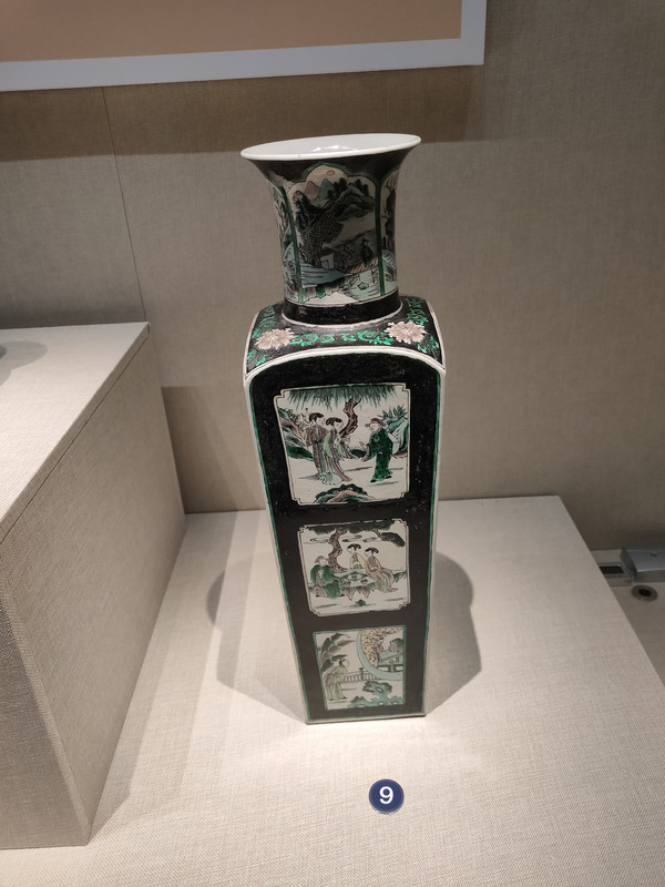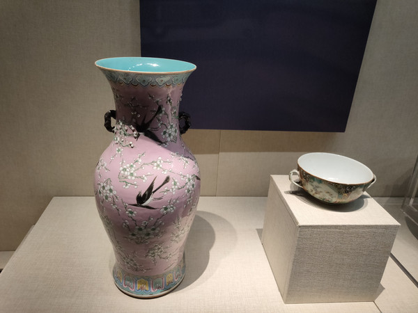 这些彩绘瓷器看起来相当的精美,有一件花瓶,内胎是深绿色的,外面绘了乳燕穿林的画面,黑色的燕子,白色的梅花,而底子则是粉色的,只在瓶底部分用了深绿色,与瓶口相呼应。