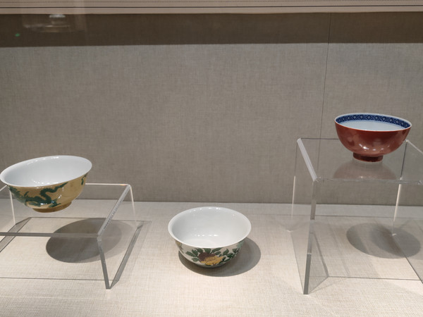 白里黄地绿釉龙纹瓷碗很富丽堂皇,这是清朝雍乾年间比较盛行的瓷器。素三彩暗龙纹花蝶瓷碗虽然名叫“素三彩”,但着色上也挺华丽。珊瑚红釉青花里瓷碗虽然只是单色,却是很华丽的血红。