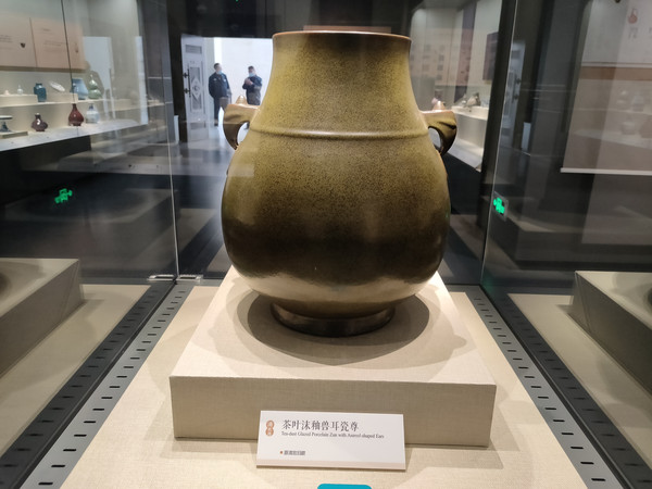 茶叶沫釉兽耳瓷尊是原来清宫的旧藏,这件作品很朴实,没有纹饰,不过釉色很细腻。只是看着这件尊,我忍不住想,茶叶这种东西,不是应该用小型的器物盛放的吗?这么大的尊,看来是存放一些给宫女太监用的茶叶沫,估计还都是比较底层的。