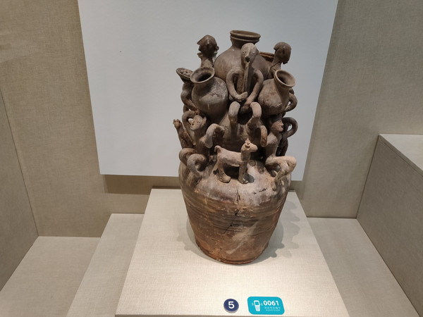 堆塑罐又称魂瓶、谷仓罐,是陶器中比较繁复的品种,由汉代五联罐演变而来,流行于三国吴、西晋时期。汉、六朝盛行鬼神崇拜,追求长生不死,魂瓶被寄予祈祷之用。五联罐只是五个壶口,造型比较简单。但堆塑罐壶口的造型那叫一个复杂,有人物有动物,有的还有故事。