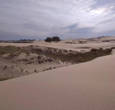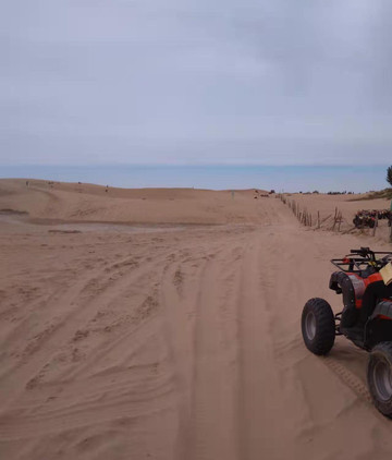 翻过了几座沙丘,地上的车辄很少,也看不到游乐区的人影了,前面依然是蓝色的海边,依然是在眼前,好象没有多远,再往前走,还真有些恐怖,四周不见人、没有植物、手机也没了信号,刮起的风都有些诡异!我们离游玩区太远了,我意识到了危险,我也没那么大的胆子,不能再继续走了,真的迷路也会耽误行程,开着摩托在沙丘的斜坡上打了几个盘旋,很是刺激,我们就返回了。其实也没有什么遗憾的,沙漠之于大海本来就是一个梦,我知道那是一种大气折射现象,也许是海市蜃楼的一种吧?因为这片沙漠本就不在海边,哪来的大海?
