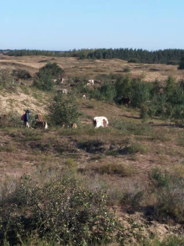 此次行程中,从内蒙古的科左后旗到赤峰市也正是“三北防护林工程”的一部分。沿途沙漠中栽满了成片的樟子松,这个树种比较耐旱,但生长也慢得多,看上去不起眼的小树也都有二十几年的树龄吧。沙漠上栽树可不是件容易的事,一般要栽十几年的大苗,还要带土移栽,后期的管理成本也不低,加上沙漠造林成活率不是很高,需要年年补植,所以看起来很稀疏的样子。在茫茫的大漠中,一点点绿色与黄白的沙地交相辉映,景色十分宜人,荒凉之感荡然无存,希望也就由然而生!