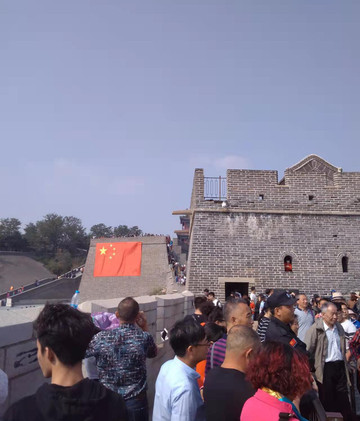 十月一日是中国建国的日子,登上长城的人特别多。悬挂在城墙上国旗,为长城增添了一抹红色,格外显眼,格外亲切!