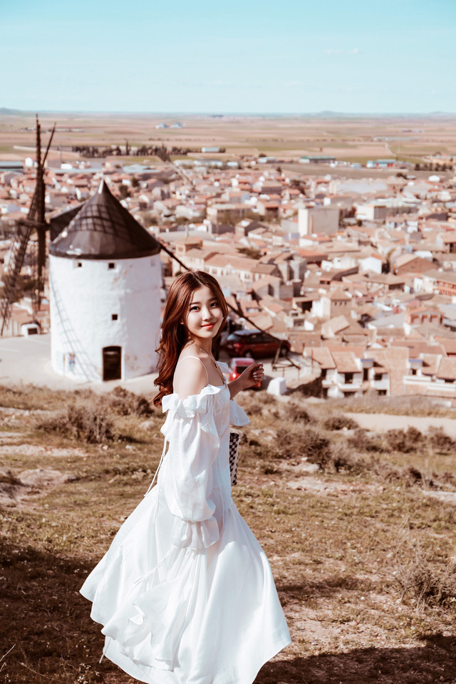 孔苏埃格拉小镇共有11座风车散落在起伏的山丘上。白色的风车和橘红色屋顶的小镇,沿着蜿蜒的山顶公路开车到尽头,顺着蓝白色台阶上去可以眺望一望无际的田野。