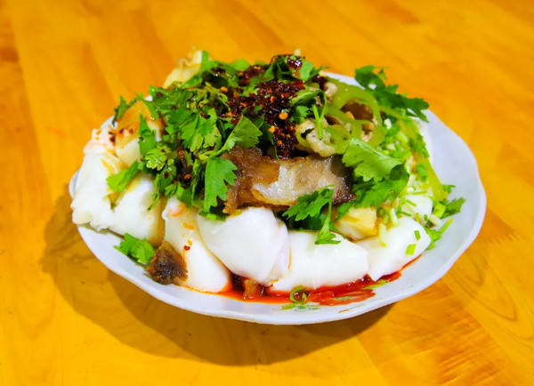 榕江方言将“烫”字说成“濑”,故称为濑粉。濑粉由榕江特产的贡米加上一点糯米混合在石磨上碾压成米浆,再将米浆按量倒入大铁盘中用大火蒸,热腾腾的濑粉新鲜、香糯、绵软,极大的保留了榕江贡米的营养和甘甜,极其美味,值得一尝。