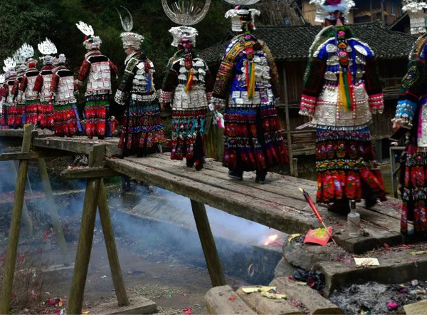 二月二祭桥节是红阳村重大节庆活动之一,俗称苗族儿童节,村民们拿着祭品走过祭桥,祈求家中子嗣昌盛、家人平安健康。