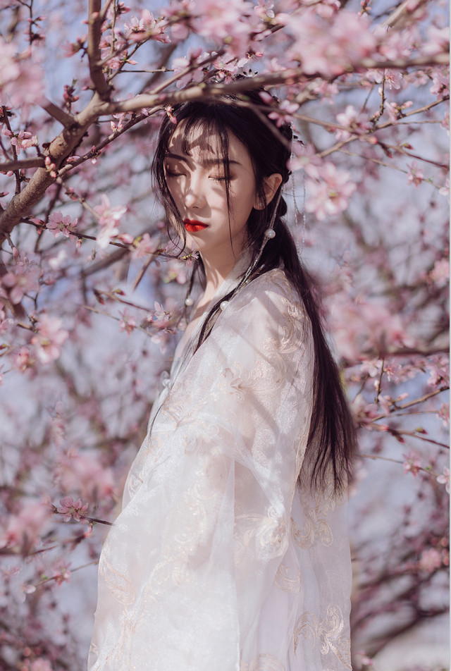 着汉服的小姐姐,专心寻找最美的那一棵桃花树,并不理会旁人的惊艳目光。
