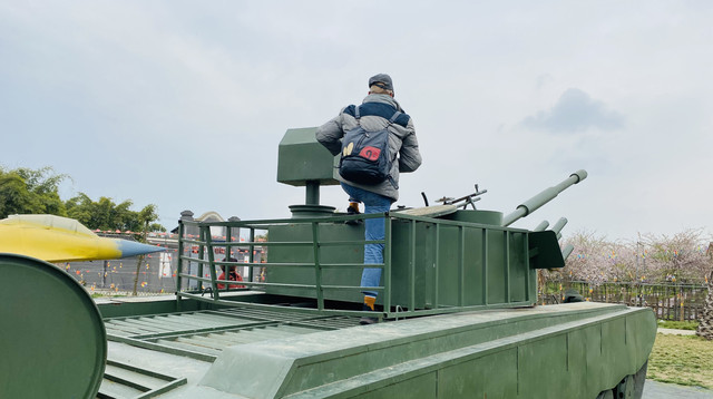 心情好,玩兴自然也高。一群人“疯疯癫癫”地四处跑,几个小姐妹拉着去了桃花林拍照,一个“二傻子”爬上了坦克车比了一个帅气的姿势,还有人去围观傻不愣登的山羊…