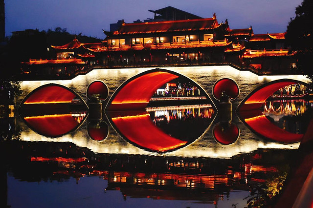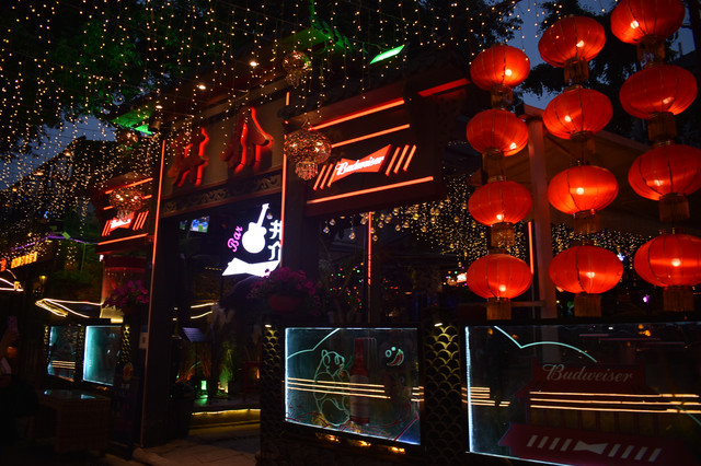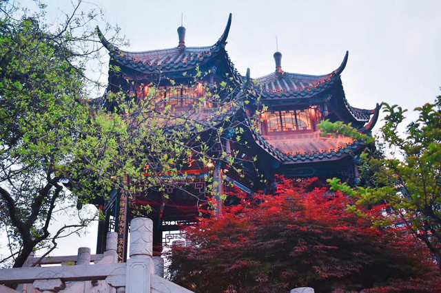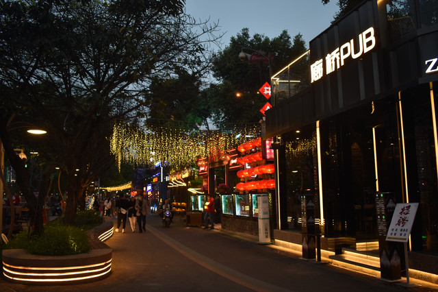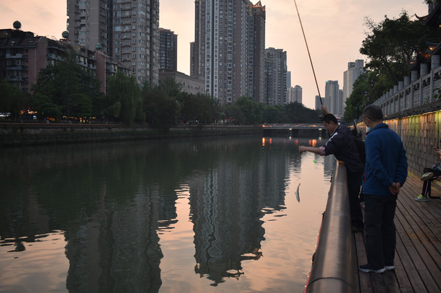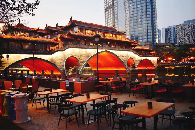 逛完武侯祠和锦里,夜色降临,适合去合江亭逛逛府南河夜景。黄昏河边垂钓的人排了一排,成都人民果然比较有闲情逸致。合江亭旁边就是廊桥,灯光夜景还挺美,附近有一条酒吧街,晚上很是热闹,这次没有找个酒吧欣赏驻唱表演、喝喝小酒感受成都的夜生活着实有些遗憾吖。