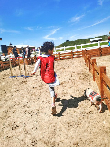 5、小猪赛跑,是一项非常棒的动物互动游戏,即不会伤害动物,又能让小朋友全情投入地参与,小朋友在赶着小猪回圈的过程中,也感受到了竞争和参与的乐趣,虽然最后没有胜出,可跟小猪一起赛跑的有趣回忆,会一直陪伴她长大。