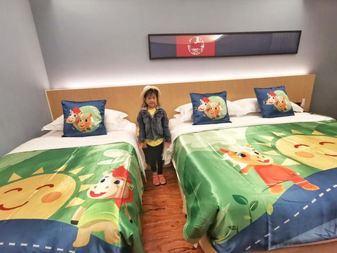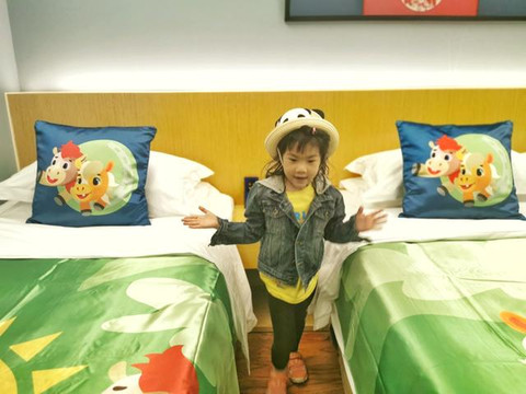 1、我们订的亲子房,一张大床,一张小床,进门以后笑笑直接奔向了她的小床,满屋的小马元素特别吸精,小马杯子,小马儿童牙刷,小马润肤霜,每一个都是小朋友的最爱。