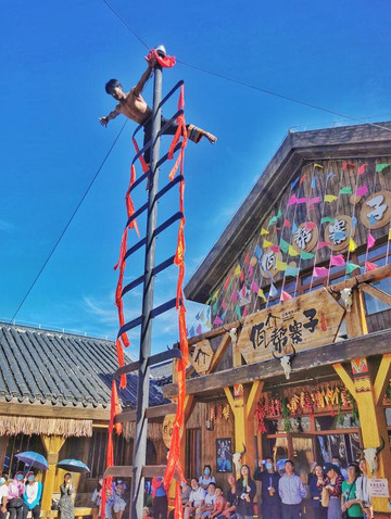 下午四点,佤邦寨子聚满了人,都是来看佤族汉子来上刀山的。长发妺妺劲爆的甩头舞以后,迎来了佤邦寨子的高光时刻,开刃的半米大刀,可以把布条瞬间剪断,佤族小伙手脚并用,瞬间爬到高过屋顶的刀山顶层,肚子顶着刀刃,全身腾空,全场瞬间沸腾一阵欢呼。