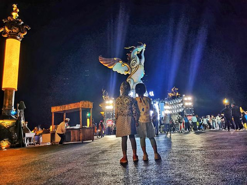 晚上,在天下第一烤羊品美食,看电音趴烟花秀。