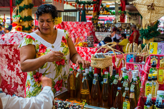 身着传统服饰的大溪地妇女,头戴花环,在这里出售各式的新鲜瓜果蔬菜,以及水产海鲜。