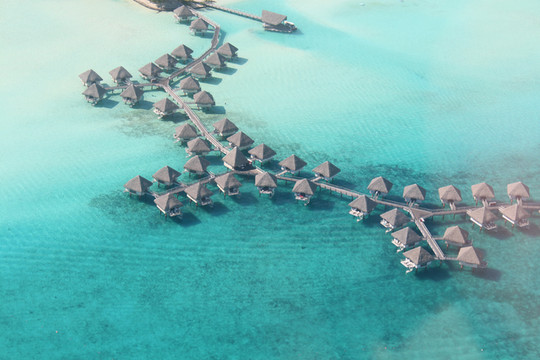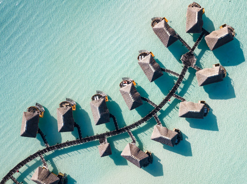 精致的水上小屋,在纯净的潟湖水上依次排列,一直延展至远方大海的尽头。