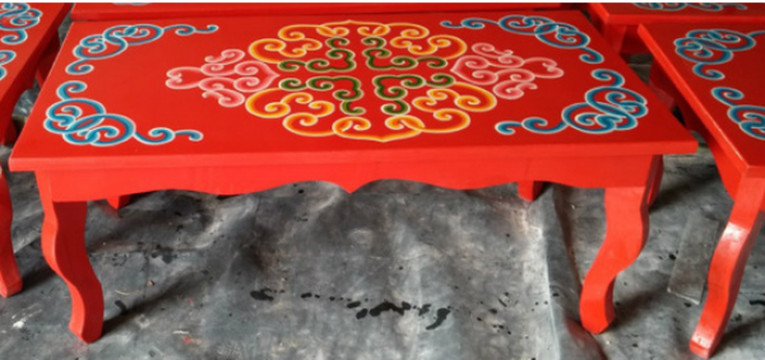 草原环境的辽阔与苍凉,促使人们更多地思考绚烂多彩的生活以减少心理上的孤寂。因而,蒙古族人民自古就有尚色的习俗,尤其喜爱高纯度的色彩,并应用于日常生活器具之中。对于蒙古族传统家具而言,原材料的特殊性加之本民族尚色习俗的影响,厚漆耋彩无疑成为其典型的装饰特征。家具主色以红色居多,黄色、绿色、蓝色是主要的装饰用色,金、白、黑、银为装饰色中的间隔色用于勾边、描线进行调和。这些高纯度的颜色在体现蒙古族人民鲜明质朴的色彩审美倾向的同时,更传递出特有的民族文化。如:主色调红色的运用源于本民族崇火的传统观念,给人以温暖和喜悦,象征着幸福和胜利,是蒙古族的民族标志之一;而黄色的运用则带有藏传佛教的宗教色彩,具有神圣、高贵的寓意。