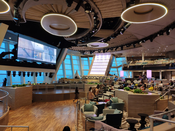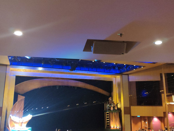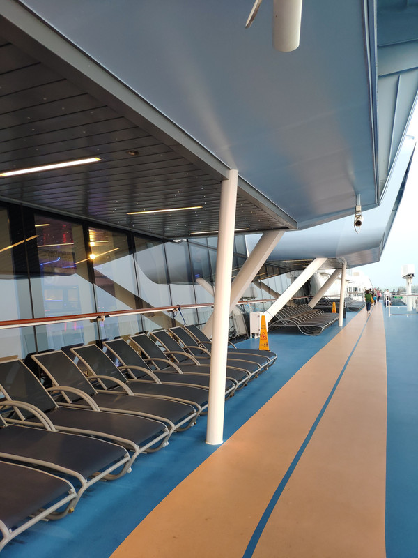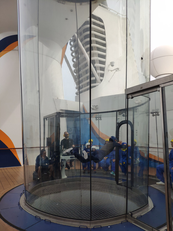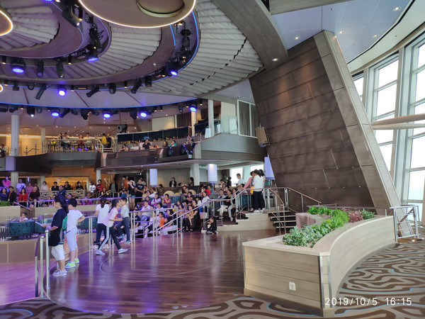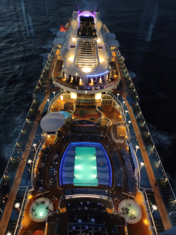 北极星要提前预约好,我们上船第一天就约好了。有两种价格,20美金的是上下移动,40美金则是在海上绕一圈。本来约的是下午的,因为工作人员的失误,排到我们的时候已经夜幕降临了。不过在北极星里俯瞰整个邮轮也美呆了。