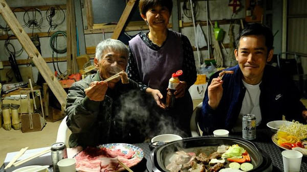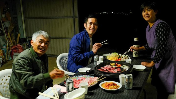 长崎和牛真的是太好吃了,放在铁板上煎烤,倒上烧烤汁,表皮微焦时最好,肥嫩丰腴,入口即化。搭配的蔬菜都是从附近的菜地中新鲜采摘回来的,自带着一股甜味。我们一边吃着烤肉,一边与山口夫妇交流,大家都越来越放松,这样的乡间夜晚真是美好。