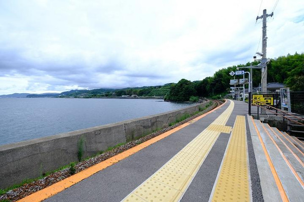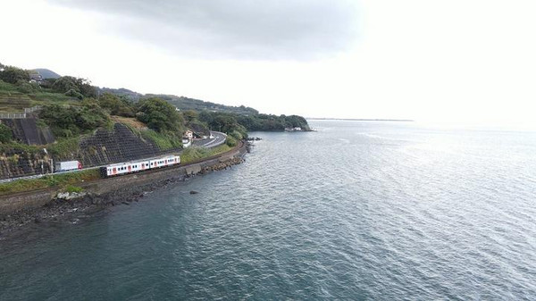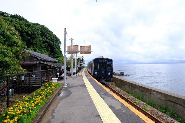 坐在列车上,窗外的风景越来越吸引,列车就贴着海岸线飞驰,清澈透明的大海,翻起的白色浪花仿佛就要拍打到车窗。列车就这样沿着不断变换的海岸线,一直向前。列车停靠在九州最美的海边车站:千绵。车站就邻着海边而建,站前是毫无遮拦的大海。不用担心,这里大概一个小时就有一趟列车通过,而且很准时,即使在乡下旅行也能让人安心。