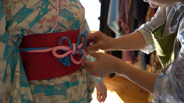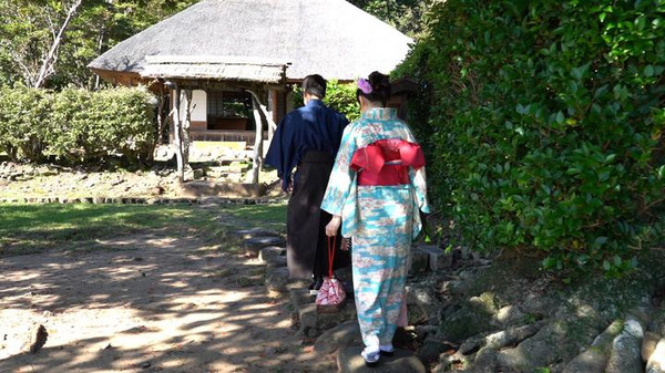 除了参观这些很有历史价值的文物,最令人印象深刻的就是在这里可以穿上和服,在1893年打造的茶室“闲云亭”内体验日本“镇信流”茶道。和服的花色很多,还有搭配的手袋。和服的穿法是很有讲究的,在这里工作的阿姨帮同行闺蜜仔细打理好。