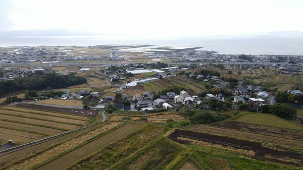 从山坡的高处俯瞰,农田簇拥着房屋,一直延伸到海边,那边就是大村湾。
