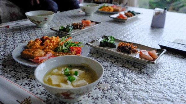 第二天早上醒来的时候,厨房已经飘出了香味。早餐是味噌汤、米饭和小菜。怕我们吃不惯,又做了炒鸡蛋,煎了火腿。这样坐在房间里,和山口夫妇一起吃早餐的感觉真好呀,能体验到这样的日本普通人家的寻常生活真的很令人难忘。