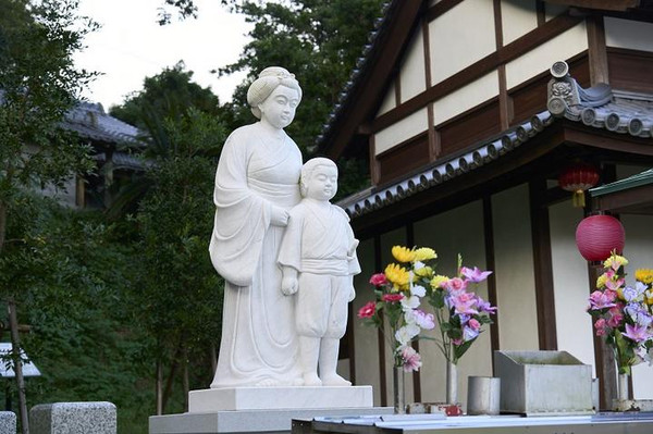 纪念馆展厅外雕刻的石像是幼年时期的郑成功和母亲田川松。