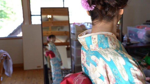终于穿好啦,照照镜子,闺蜜的这一身和服很好看呢。