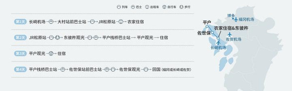 JR九州铁路周游券分为北部九州(3日券、5日券)版和南部九州版(3日券)、全九州版(3日券、5日券、7日券),大家可以根据自己规划好的行程进行购买和使用。这次推荐的行程是九州长崎四日之旅(如下图),最适合的依旧是北九州版的3日券。
