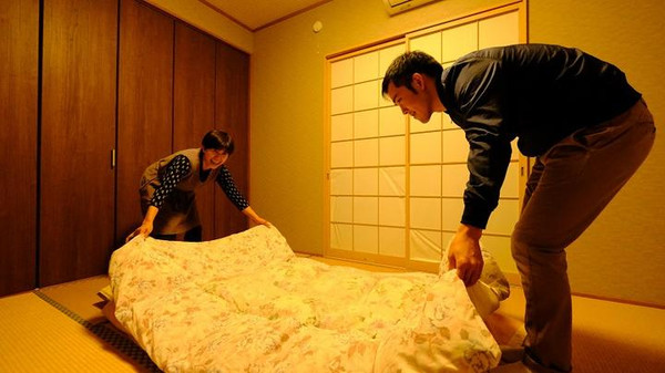 准备睡觉啦,房间是传统的日式房间,白天这里是活动空间,大家席地而坐,到了晚上,把被褥从柜子里拿出来铺好就成了床。山口夫人帮着在地上铺好被褥,很有爱,温暖人心。
