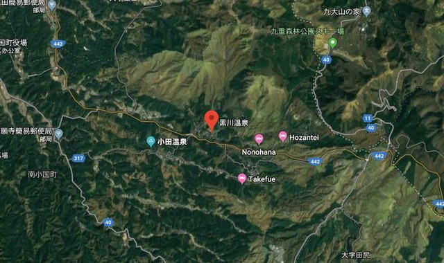 我们在google map里面也可以看到,黑川温泉被四周的群山包围着,只有一条公路经过这里。