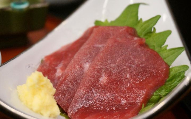 套餐里还有马肉刺身。熊本的生马肉比较有名,据说几乎全日本的食用马都集中在这里!相对于生牛肉来说,马肉刺身吃起来没什么腥味,口感也更容易接受一些。