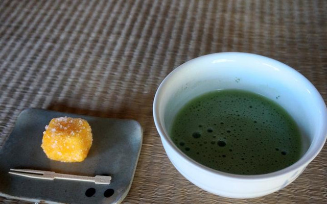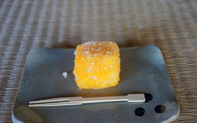 在平户,茶道配合的点心也是自带地区特色。这款金黄色的小蛋糕,是400年前来到日本的神父们传授给当地人的。它就是在长崎蛋糕的表面再裹上一层粗糖,外表酥脆内里松软,超级好吃!