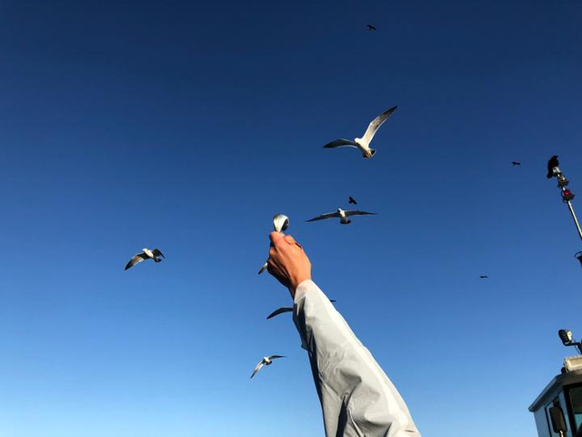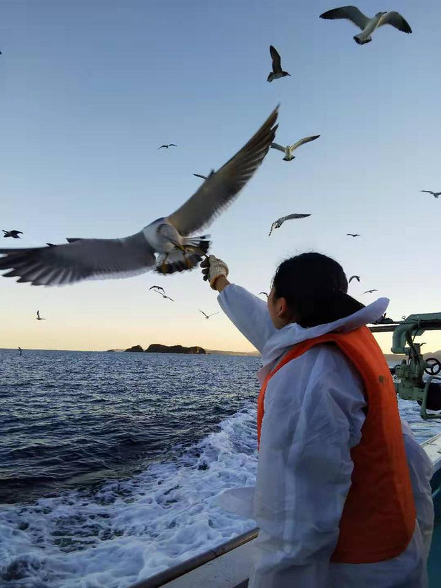 从岸边出发,大概10分钟就能去到捕鱼的海域。一路开船,会有很多海鸥像是“跟屁虫”一样伴随在船的周围,一起趁着晨光出发。