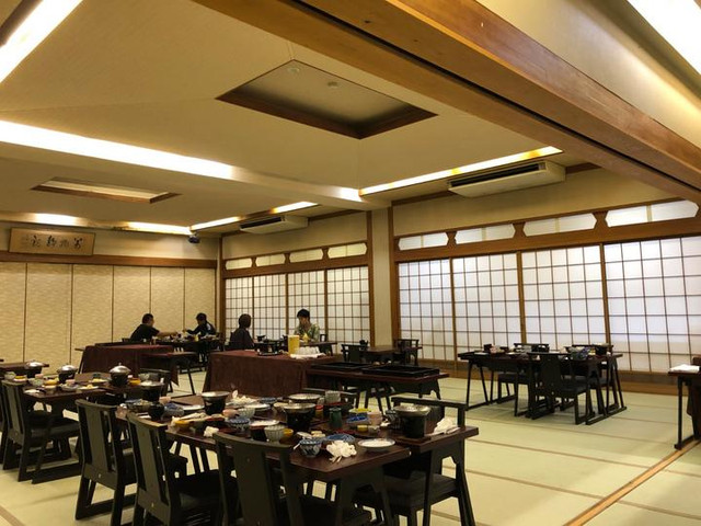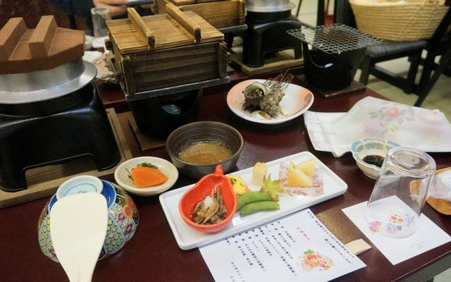 通常日本温泉旅馆都是一泊二食,住一晚,早晚两餐。晚餐花花就是在旅馆的餐厅里完成的。入住登记的时候,已经约好了用餐的时间,在你去到餐厅之前,店员会提前在桌子上把你的房号放好,这张桌子就是你的了。