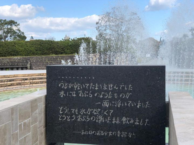 和平公园里有一个直径15米的喷泉池,叫"和平之泉"。在原子弹的轰击后,人们的身体都烧烂了,受伤的人口渴的受不了。但当地的水源也已经被破坏,根本没有办法找到干净的水源。在日本全国各地的捐款下,长崎修建了“和平之泉”,希望可以给这些悲惨的灵魂献上一杯水,祈求他们的冥福。同时也为了祈祷世界永久和平。
