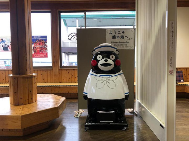 码头等候的区域非常宽敞,位置也很多,里面还有一只穿着水手服的熊本熊,十分可爱!
