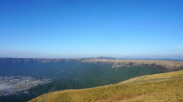 山脚下的草千里是日本为数不多的草原之一。如果你在春夏季节到来,你能看到大片大片的绿色,还会有泰然自若的牛马在散步,也颇有内蒙古大草原的风貌。
