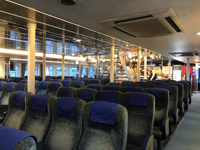 登船口在码头的2楼,顺着指示牌一路向前走就行了。船上也没有固定座位,喜欢在内舱坐着,或者在甲板看看都没问题。