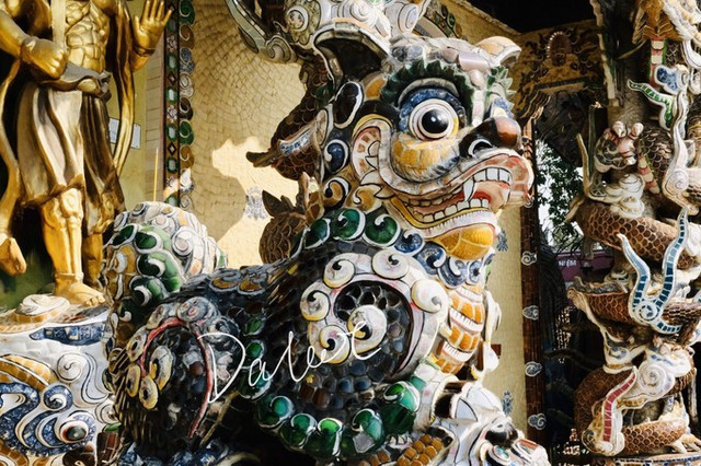 每一根梁柱,都以盘龙雕饰,每一条盘龙,卧龙,飞龙又以各种吉祥纹案装饰,每一种吉祥纹案又以不同的纹理,图案,色彩构建而成,是一个浩大的工程,得见曾经的 越南 兴旺的陶瓷制造业。