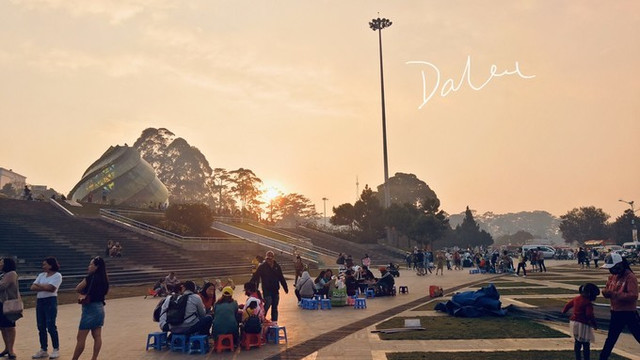 临近黄昏,越发觉得 大叻 的空气质量实在是太差了,能见度虽有,却是一片又一片的雾霾。即使是这样的环境,都有人在湖上泛舟。广场上学生,年轻人围绕着小摊子吃炸串,青年在组织跳舞,真是又有活力又污染可怕。