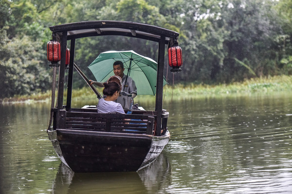 本来是一个安静的橹船行驶在水面上,一场突如其来的暴雨打破了这里的宁静,却多了几分诗意的情怀。无论是坐在船上的我们欣赏对面橹船上的人还是对面橹船上的人看我们,本身就是一种意境禅了。大雨中的橹船在这水面上传达了烟雨江南本有的气息,你们喜欢吗?