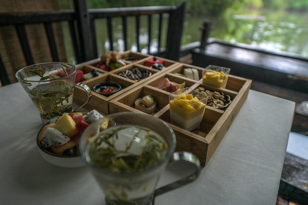 如何去杭州西溪湿地感受西溪且留下这种意境呢?我有个比较不错的方式,那就是选择乘橹船吃下午茶,一边欣赏湿地美景一边感受这种气息。故而,山野君我就选择了西溪湿地悦榕庄的橹船下午茶来模拟葛优在当时的场景,一般都能感受到这种意境。