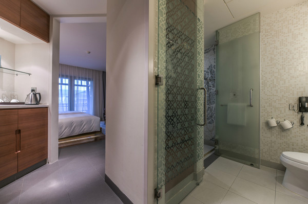 从客房大门进入就是卫生间正门了,可以看到洗漱间、更衣室以及淋浴室。房间都是干湿分离的设计,硬件条件与软环境都是很不错。这种开业于2011年的老酒店有这样的配套设施可以说是相当的给力了,期初就是比较专心地去打造这家,否则这个时候也会被淘汰掉。