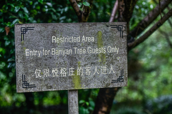 在通往酒店游船区域、西溪湿地私家园林等片区的地方可以看到一个牌子,上面写着仅供悦榕庄客人进入。因为西溪湿地是一个开放式的景点,虽然说酒店拥有较为独立的园区,可是西溪湿地的整体性没有被分割开来,所以才会立下这种牌子以防止景区游客走错了地方。