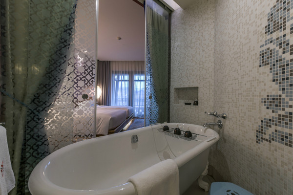 干湿分离内的淋浴房也有一个大浴缸,浴缸的质量超级好,这一点是出乎我的意料。从浴缸朝向房间的这个门以及淋浴间的门形成一个相对封闭的空间,私密性很好。一般选择标间的人都是两个隐私相对独立一些的,这样的卫生间设计可以保证一个人在洗澡的同时也不会影响另外一个人正常使用卫生间。